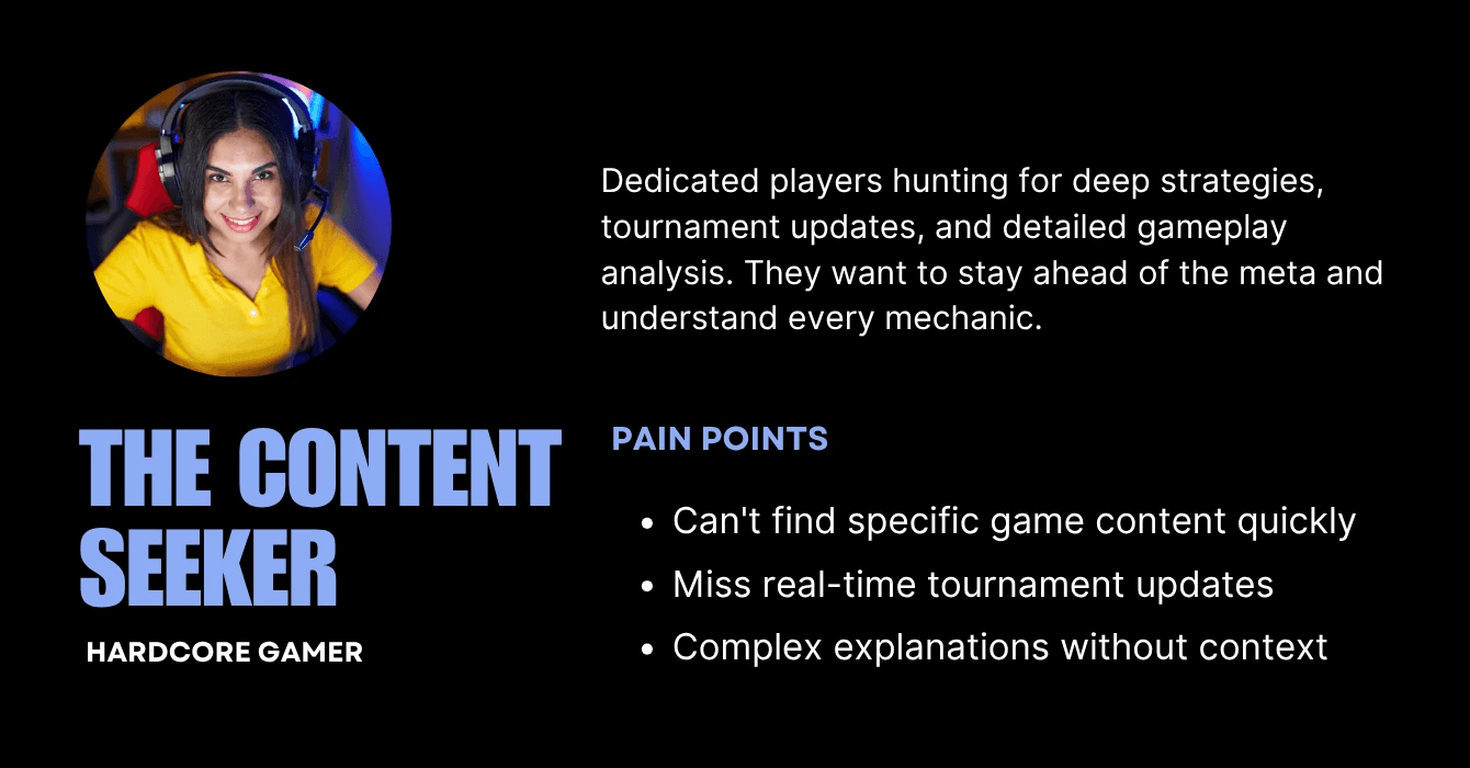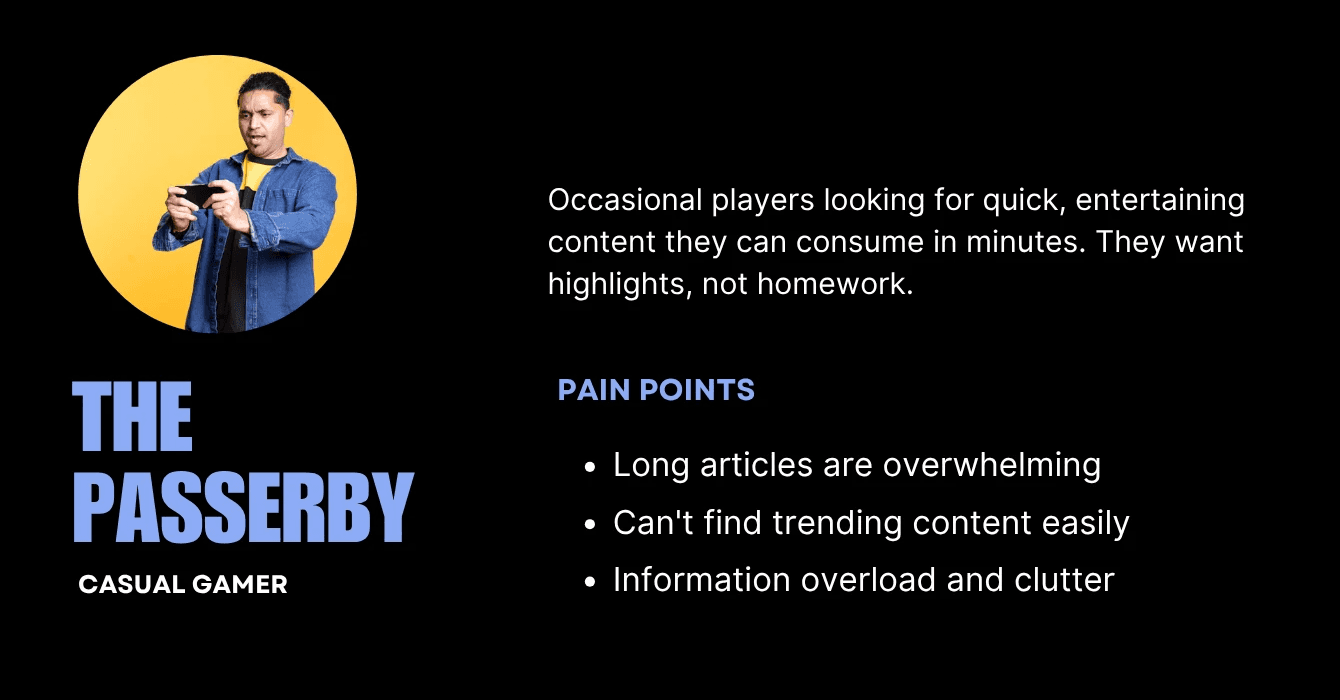 Through user interviews with 12 gamers, I discovered the real issue wasn't the content — it was treating everyone the same. DG News had two distinct user types with completely different needs, and the platform was failing both.