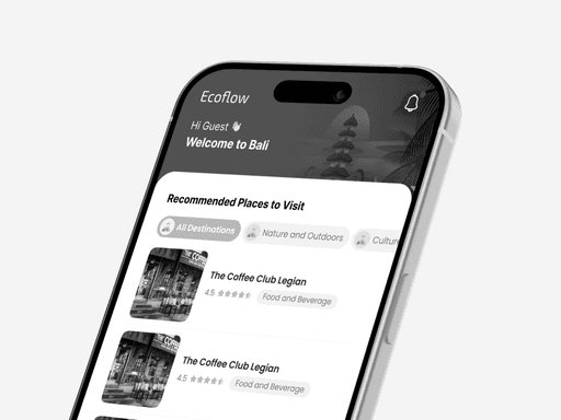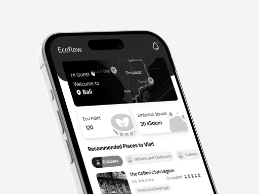 EcoFlow is a travel app concept designed to make Bali tourism more seamless, fair, and sustainable. Powered by real-time telco data, the app helps travelers avoid overcrowded spots, supports local businesses, and rewards eco-friendly choices.