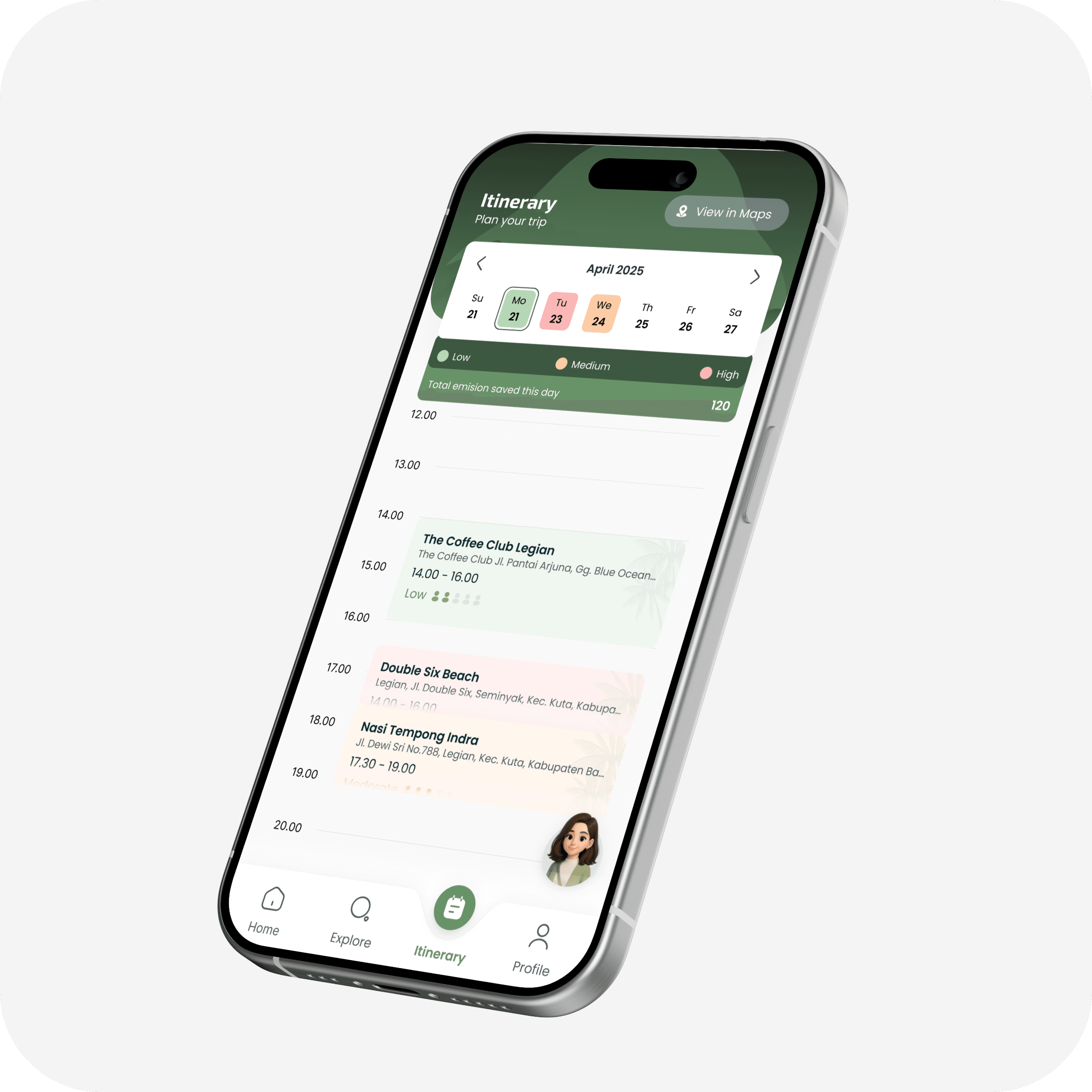 Timeline view integrates scheduled activities with real-time crowd data. Users see their daily environmental impact and can adjust plans on the fly when crowd levels shift.