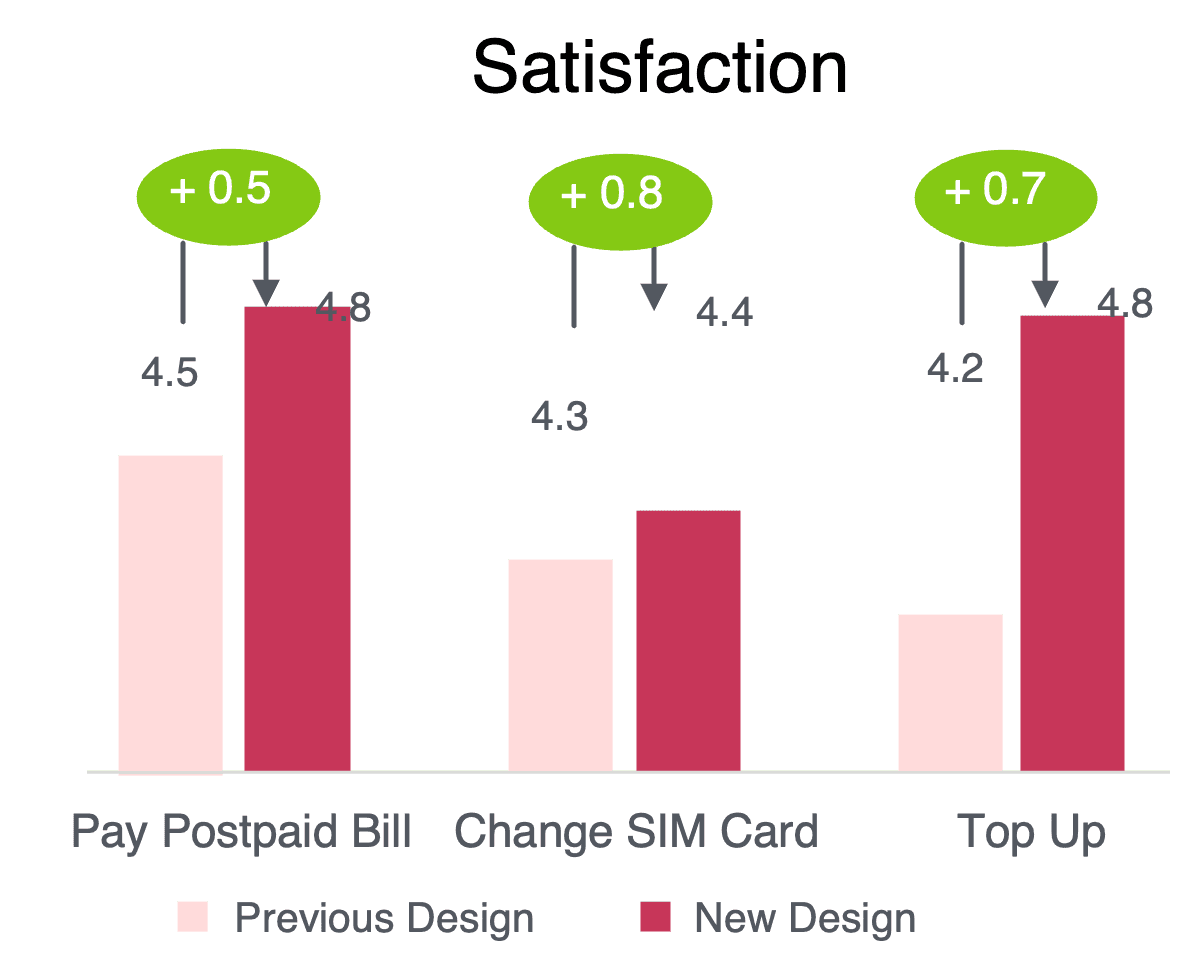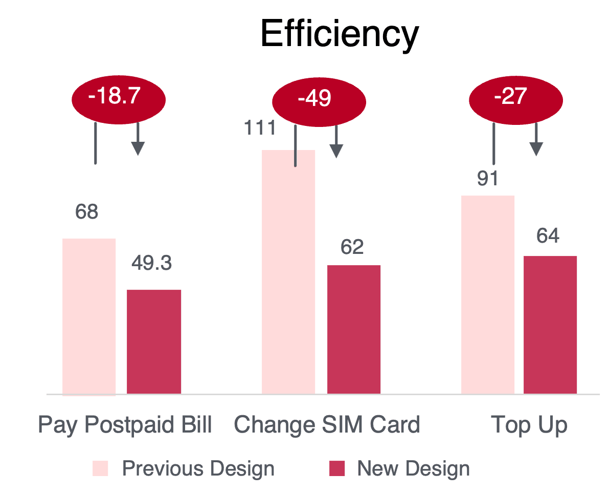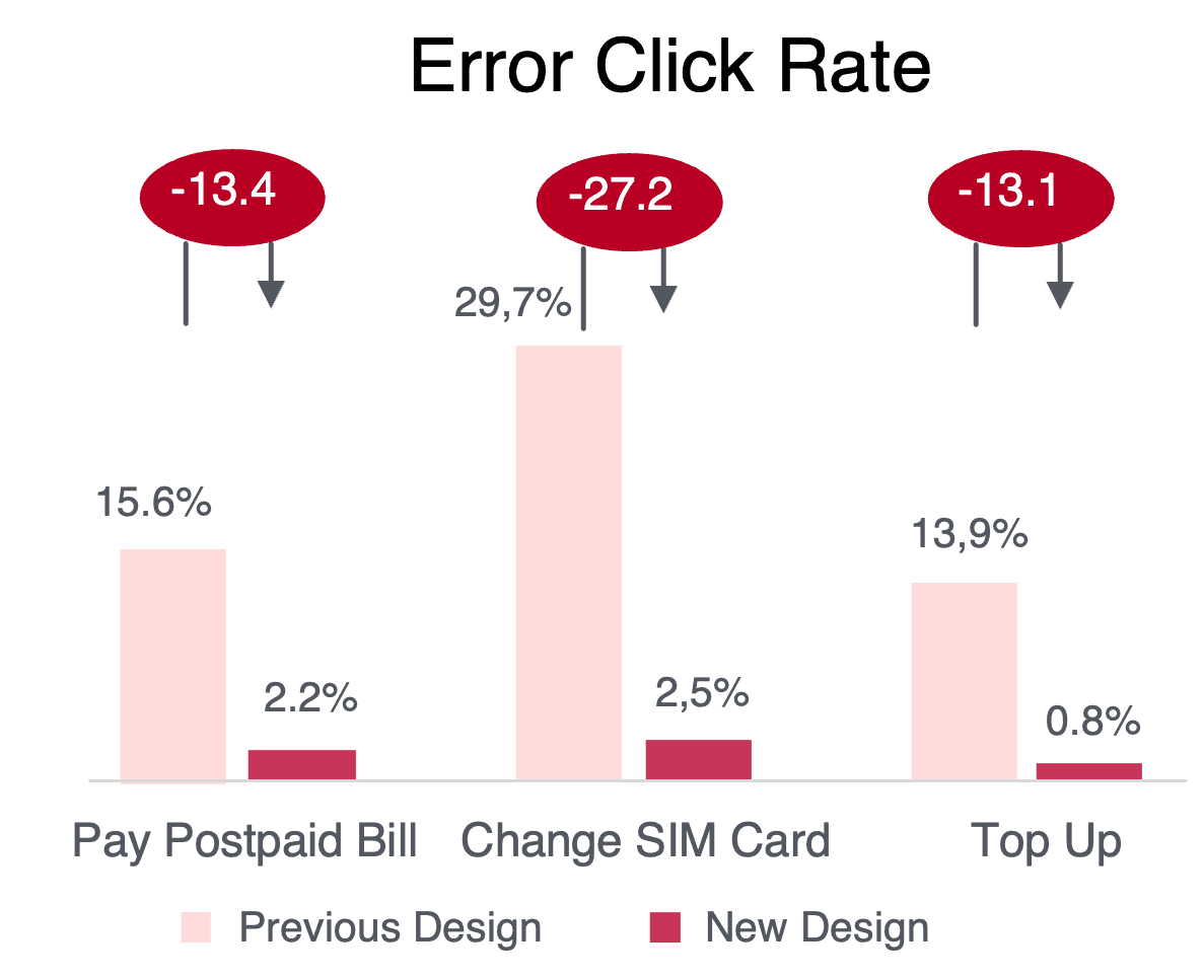 The SIM card change task—our worst performer—improved by over 27 percentage points. Users could now complete it with 97.5% success, and error rates dropped from nearly 30% to just 2.5%.
