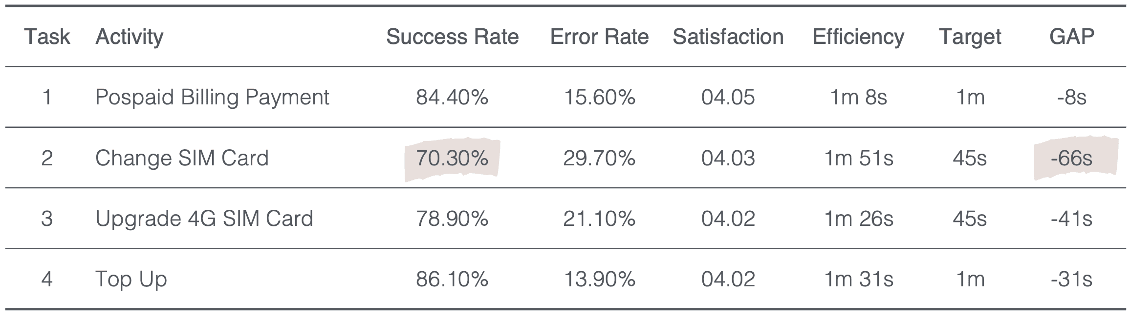 The SIM card change task was a disaster. Nearly 3 out of 10 attempts failed, and even successful attempts took over a minute longer than they should. Users were clearly struggling.